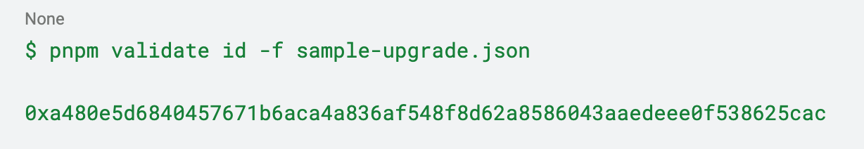 - When users attempt to approve an upgrade with their wallets, the only data displayed is the upgrade ID. To ensure they're approving the correct upgrade, users must recalculate the ID locally and verify that it matches the one shown in their wallets. For example: